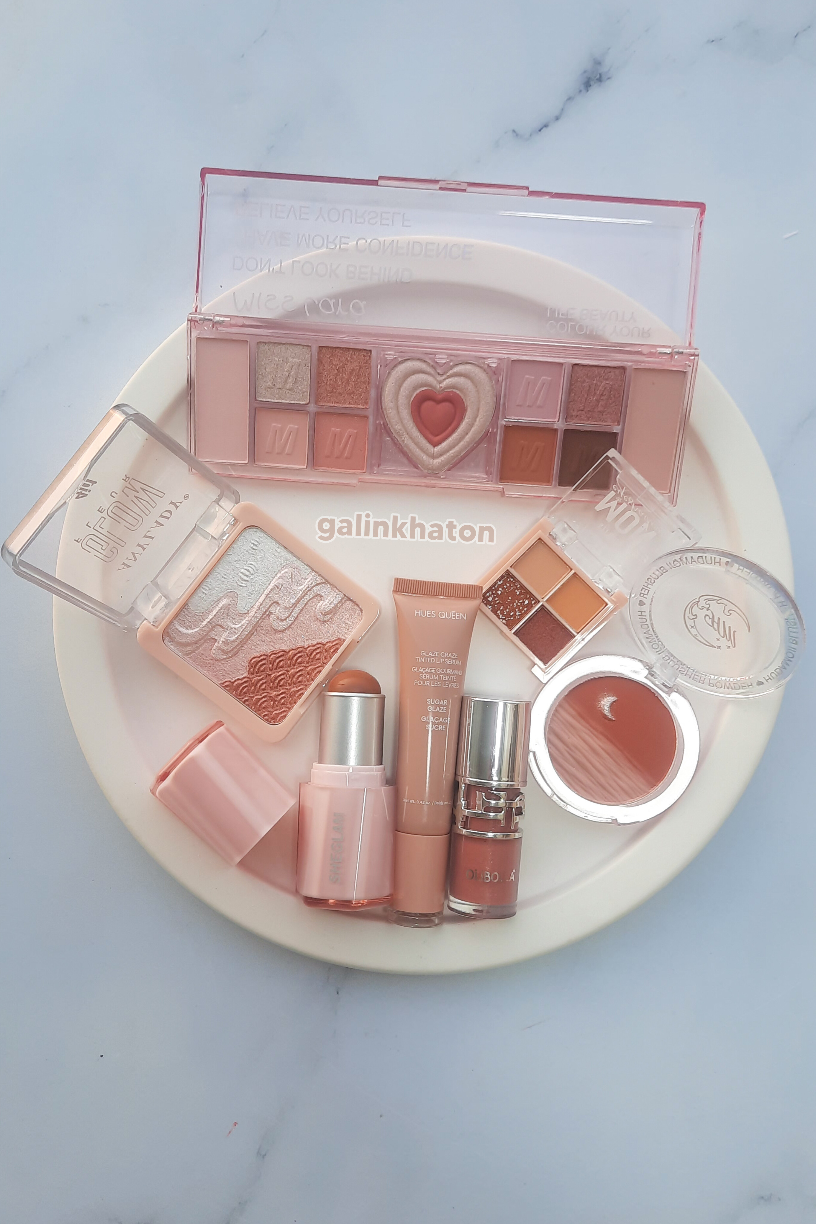 ست آرایشی نود گلین‌خاتون با پالت ۹ رنگ، رژگونه نارس، لیپ گلاس دوپ دیور و کلیپس پلومریا — ترکیب لوکس و خاص برای استایل روزانه